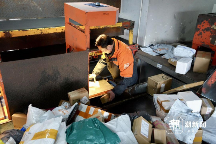 快递员朱双海正在分拣包裹 见习记者 陈卓妤 摄